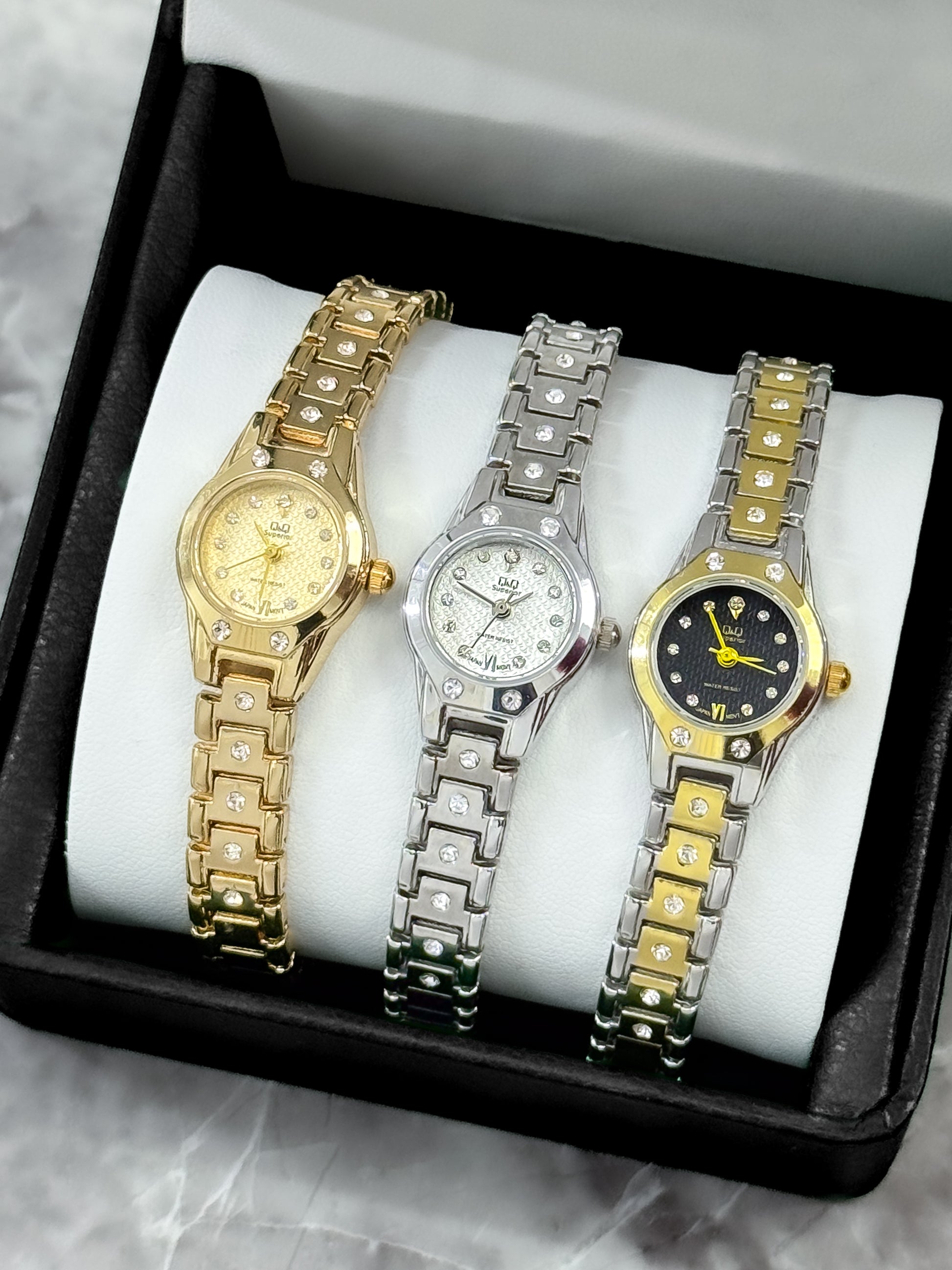 Este set Superior ofrece el máximo lujo y versatilidad. Tres relojes pequeños, delicados y femeninos, con detalles de cristal en caja y pulso, que te permiten elegir el brillo ideal para cada día: clásico, dorado o bicolor.